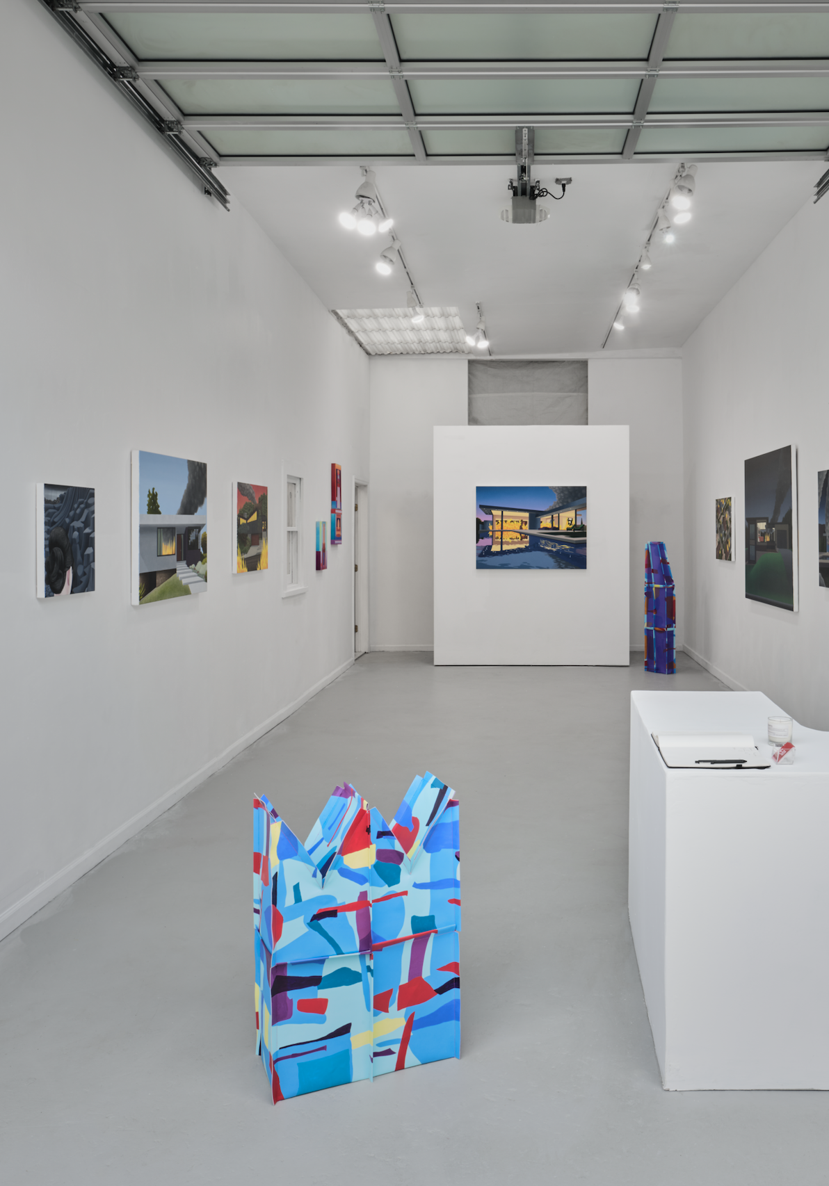 Brooklyn-based Tiantian Lou approaches architecture differently, focusing not on destruction but on softening. Working across painting and sculpture, Lou examines monumentality as a language of permanence, authority, and order. Her stacked panel paintings compress architectural geometries into carefully balanced compositions, where forms hover between building and object.