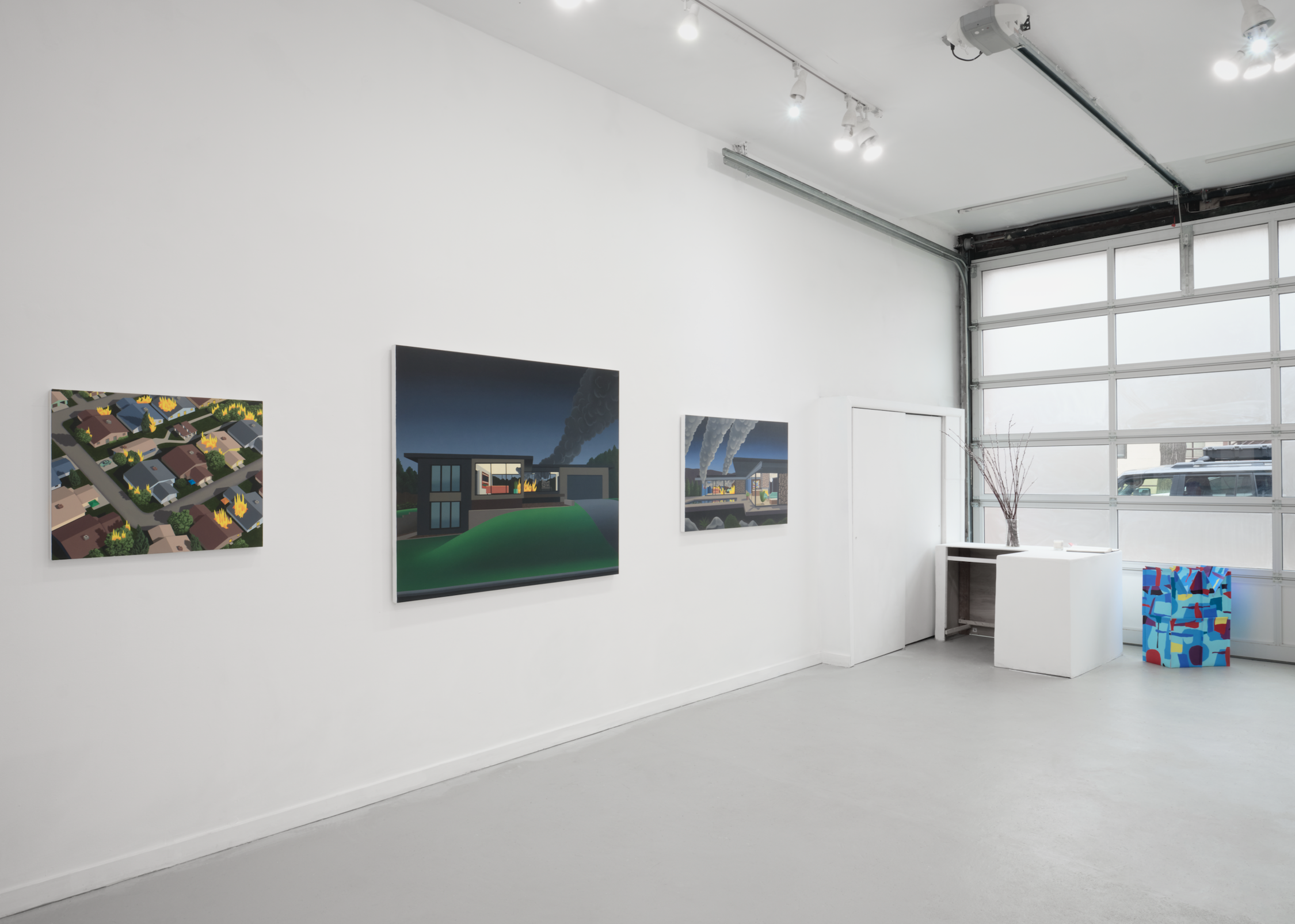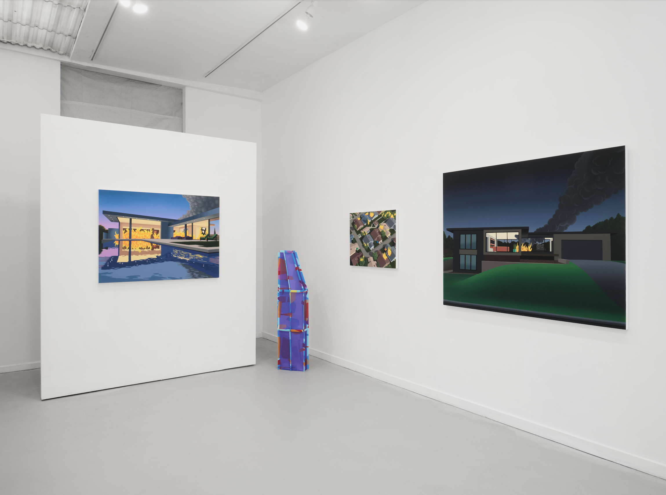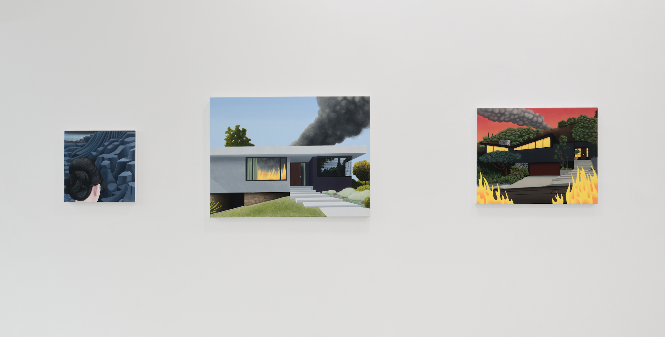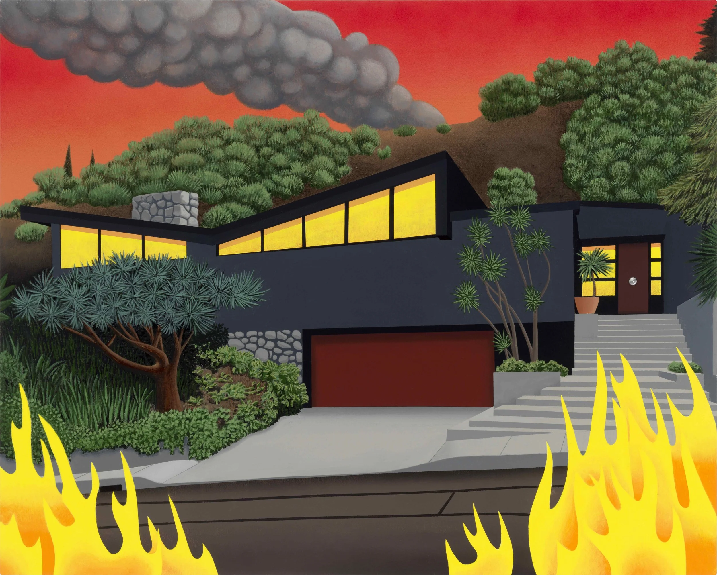 Dan Oliver’s paintings merge personal memory with contemporary unease, transforming moments of rupture into images rendered with surprising calm. Drawing on the legacies of the Chicago Imagists and twentieth-century Surrealism, he depicts intimate scenes of chaos, domestic interiors engulfed by flame, objects caught mid-collapse, yet executed with a serene precision that belies their catastrophic content. In these meditative, still-life-like narratives, destruction is witnessed only by flora, fauna, and the inanimate objects that populate each space. Oliver suggests that when we fully acknowledge the impermanence of the structures we inhabit - both literal and psychological we can encounter a strange form of acceptance and clarity.