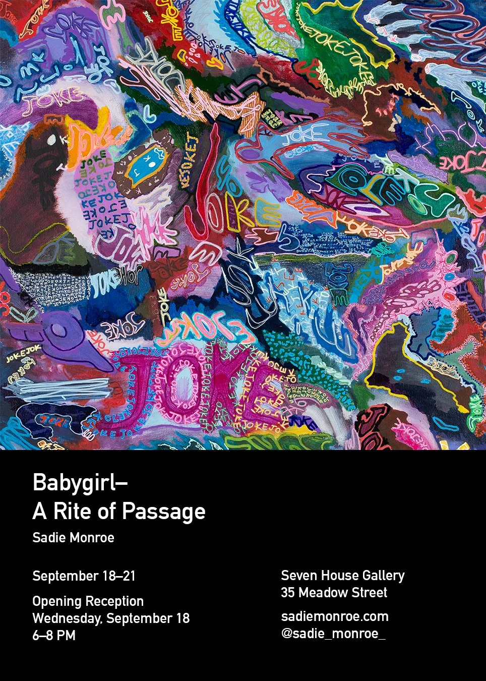 Make sure to check out Sadie’s Instagram @sadie_monroe_, where you can also enter to win a printed art journal featuring her writing related to “Babygirl” this week. These are so moving—a big win if you win. Please keep the exhibition dates in your calendar and stay tuned for more!